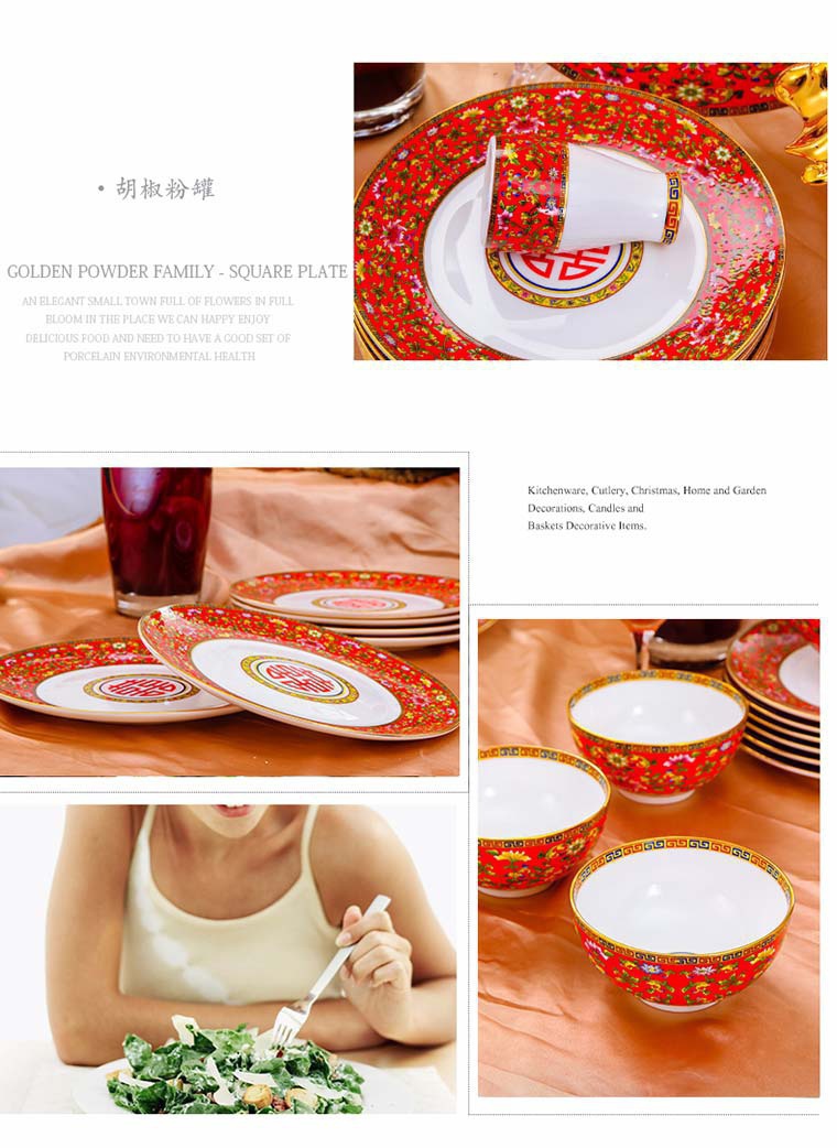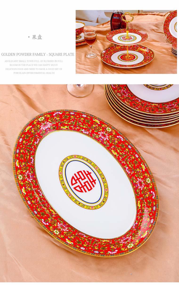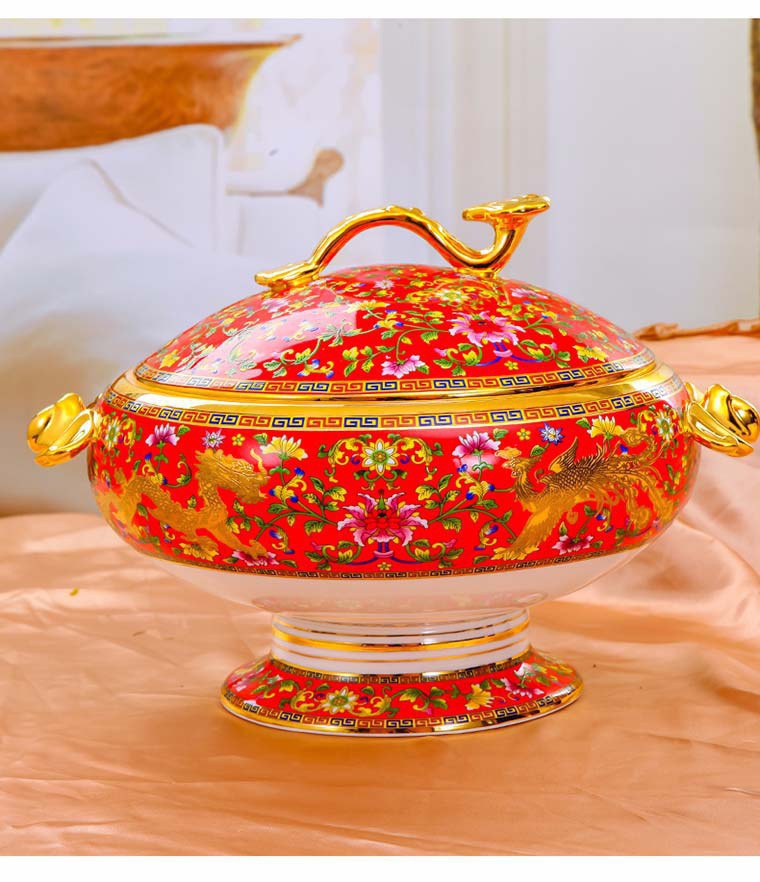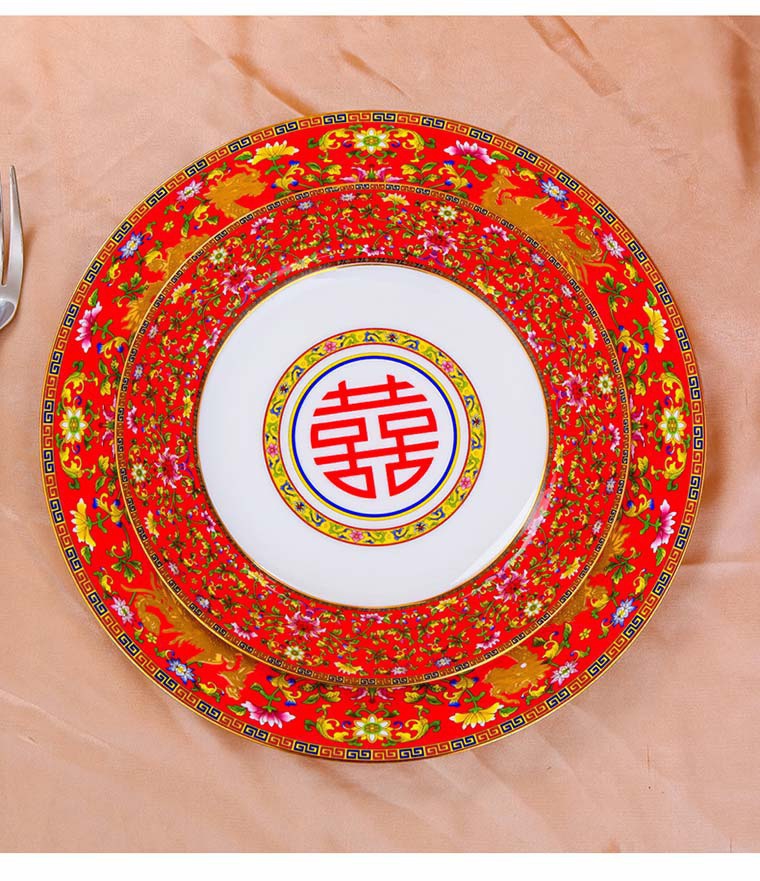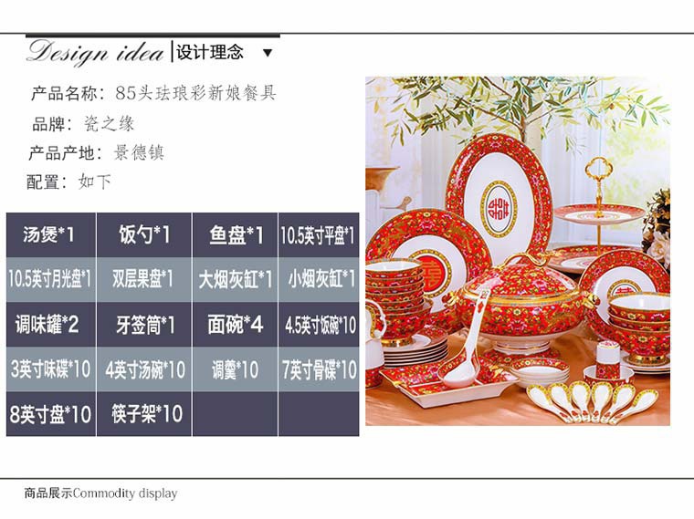 85頭琺瑯彩新娘餐具,一個湯煲,一個飯勺,一個魚盤,一個10.5寸平盤,一個10.5寸月光盤,雙層果盤一個,一個大煙缸,一個小煙缸,二個調(diào)料罐,一個牙簽筒,四個面碗,十個4.5寸飯碗,十個三寸調(diào)味碟,十個4寸湯碗,十個調(diào)羹,十個7寸骨碟,十個8寸盤,十個筷子架。