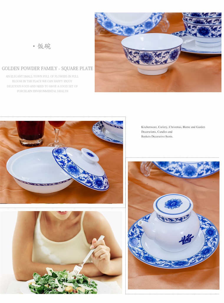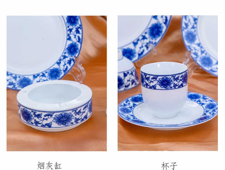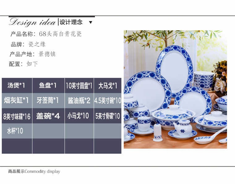 68頭高白青花瓷,一個(gè)湯煲,一個(gè)魚(yú)盤(pán),一個(gè)10寸圓盤(pán),一個(gè)大馬戈,一個(gè)煙缸,一個(gè)牙簽筒,兩個(gè)醬醋瓶,十個(gè)4.5寸碗,十六個(gè)8寸碟,四個(gè)蓋碗,十個(gè)小馬戈,十個(gè)5寸骨碟,十個(gè)水杯。
